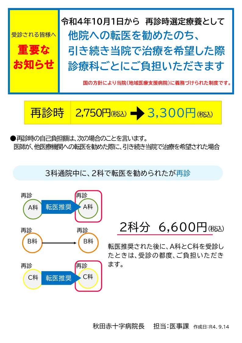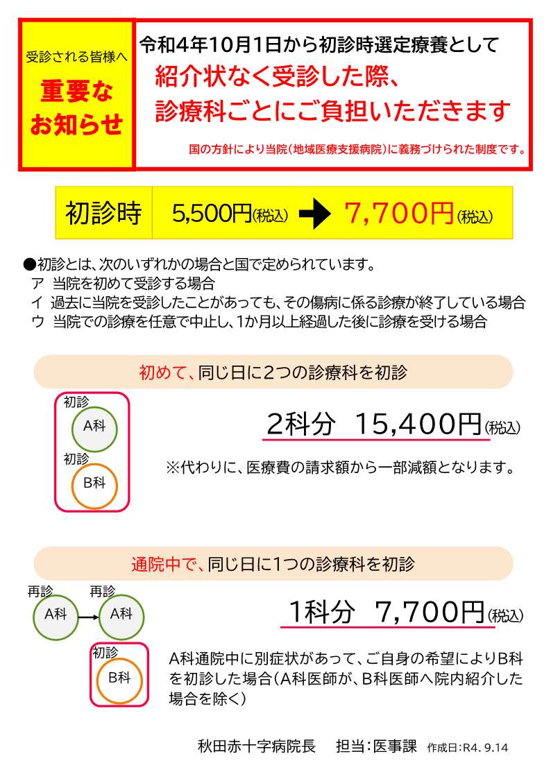 令和4年10月から初診時・再診時のご負担金(選定療養費)が変わりますので、下記をご確認ください。