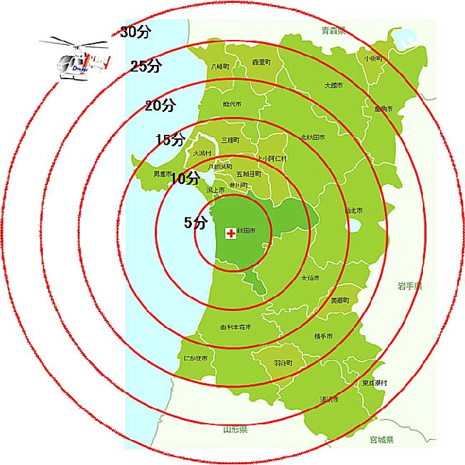 - 基地病院を離陸してから、県内各地へ約30分以内に到達できます。