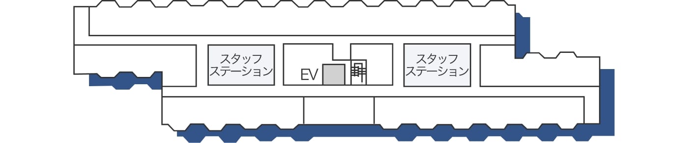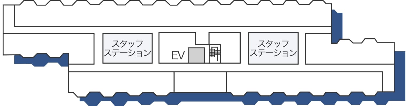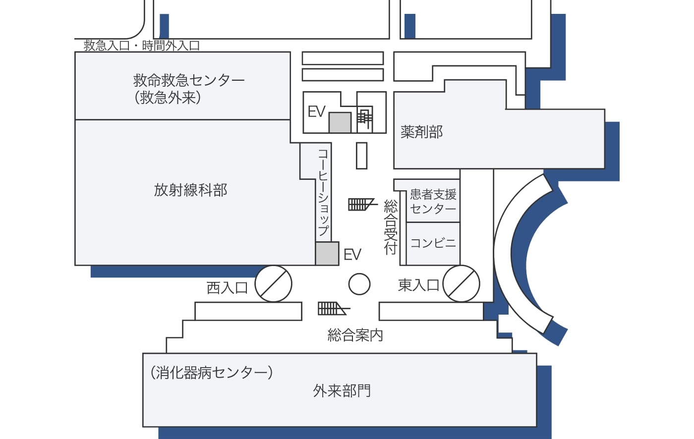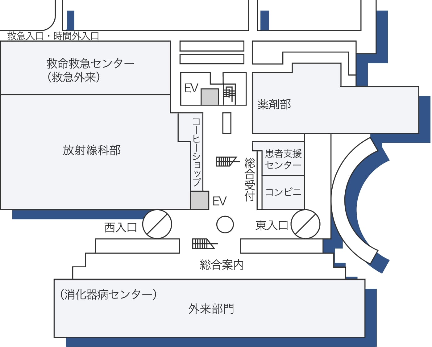 | 1階 | 総合案内、総合受付、外来部門、救命救急センター(救急外来)、 消化器病センター、薬剤部、放射線科部、患者支援センター、 コンビニ、コーヒーショップ 等 |