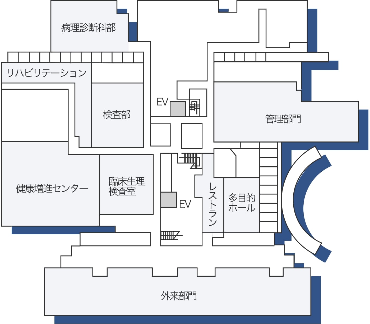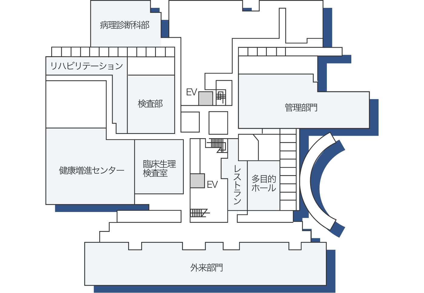 | 2階 | 外来部門、健康増進センター、検査部、病理診断科部、 リハビリテーション科部、管理部門、レストラン 等 |