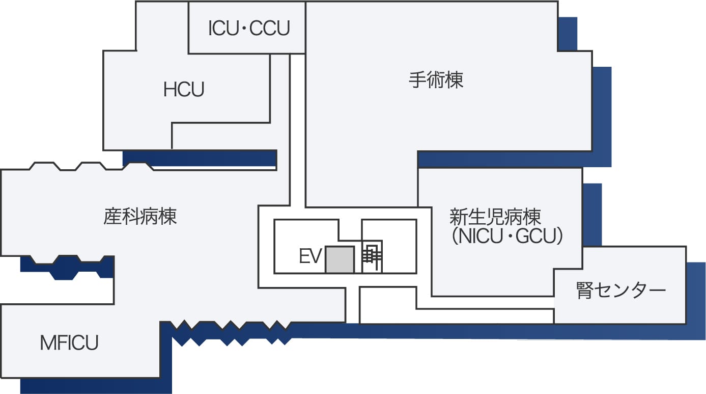 | 3階 | 手術棟、腎センター、救命救急センター(集中治療室)、 総合周産期母子医療センター(産科病棟、新生児病棟) 等 |