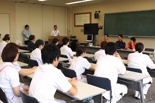 6月26日(火)、夜間に病棟で火災が発生した想定のもと、消防への通報、初期消火、模擬入院患者の避難誘導を行いました。訓練では、模擬入院患者が自分で歩くことができるのか、車椅子なのか、など状況に合わせて、不安を和らげるような声かけをしながら誘導しました。
