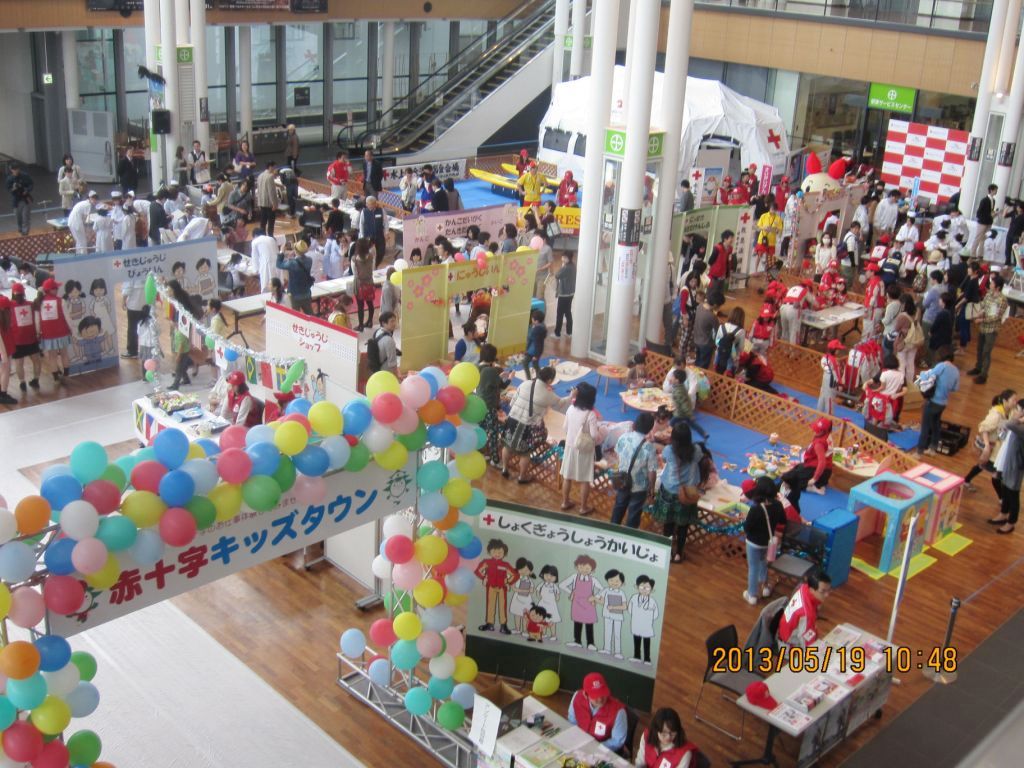 5月19日(日)、秋田駅となり“アルヴェ”で「赤十字キッズタウン」が開催されました。本事業は赤十字運動月間に合わせ、県内6つの赤十字施設(日本赤十字社秋田県支部、秋田赤十字病院、秋田県赤十字血液センター、秋田赤十字乳児院、日本赤十字秋田看護大学、日本赤十字秋田短期大学)が行っているもので、赤十字の活動を子供たちとそのご家族に広く知ってもらうことを目的としています。幼稚園児から小学生まで、約150名が参加しました。