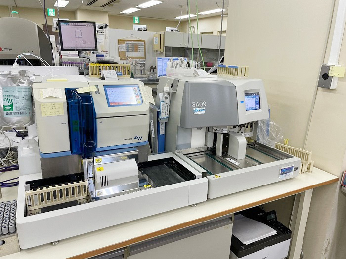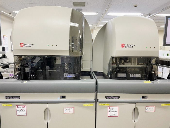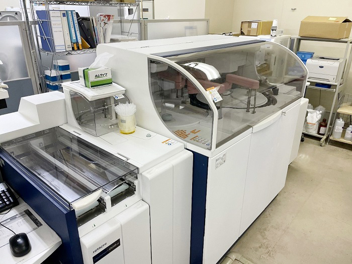 自動分析装置を用いて血液中の血球成分(白血球、赤血球、血小板など)を数えたり、サイズを測ったりすることによって各種の貧血や血液疾患の疑いがないかを調べます。