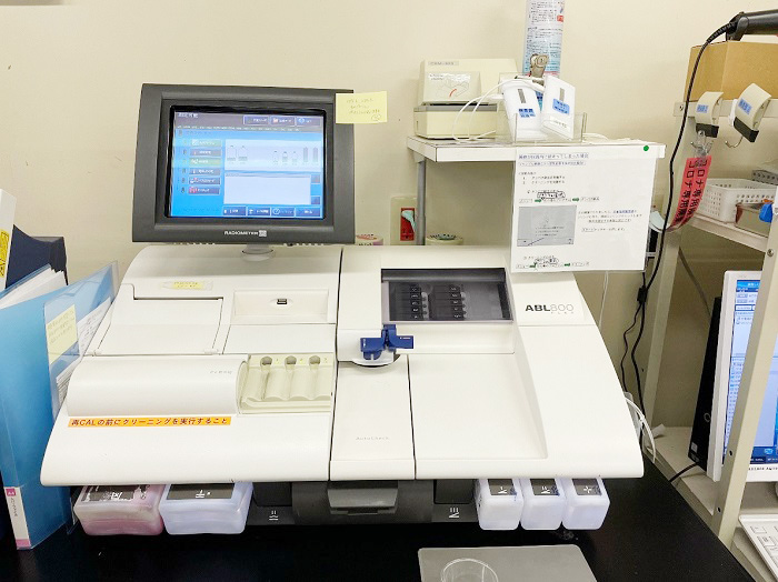 血液ガス検査では動脈、静脈から採取された血液を分析装置にて測定します。血中に含まれる酸素や二酸化炭素の量、pHから呼吸の状態(ガス交換)や体の中の酸性・アルカリ性を評価することができます。