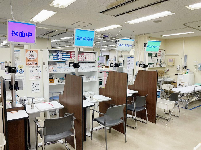 採血室では患者さん自身で端末に診察券を入れていただき、受付をしていただくシステムを導入しています。8時から尿カップをお渡しして採尿を始めており、8時15分からは採血を行っています。採血台は6台稼働しており、最大6人の看護師・臨床検査技師で採血を行っております。