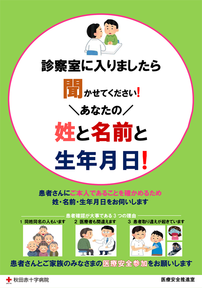 診察、検査、処置を行う際や食事配膳時に、ご本人であることを確認させていただくために、お名前(フルネーム)と生年月日を名乗っていただいています。確認のために、何度も名乗っていただくことがありますが、ご理解ください。
