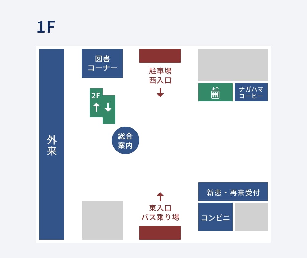 正面玄関(東・西)からお入りになり総合案内近くの階段から2階へお上がりください。