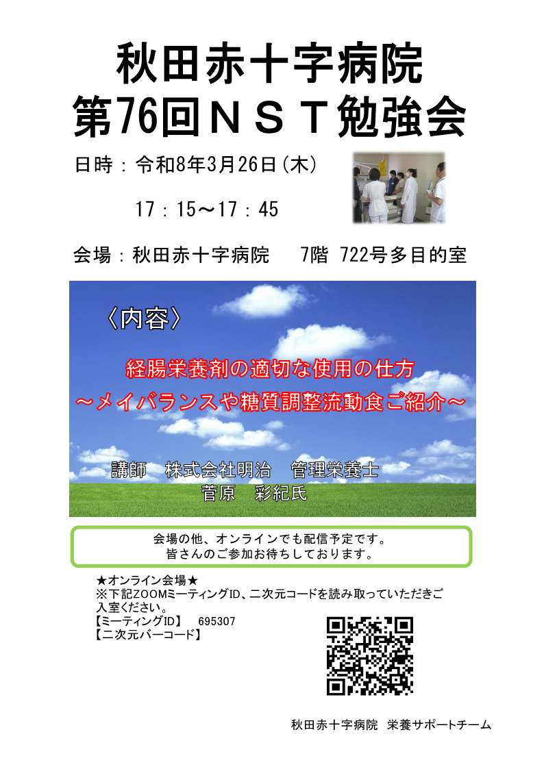 2026.03.06医療関係者の方 第76回NST勉強会開催のお知らせ 医師及びメディカルスタッフのご参加をお待ちしております。 内容 経腸栄養剤の適切な使用の仕方~メイバランスや糖質調整流動食ご紹介~ 講師 株式会社明治 管理栄養士 菅原 彩紀氏 日時 令和8年3月26日(木) 17:15~17:45 場所 秋田赤十字病院 7階 722号多目的室※オンライン(ZOOM)でも配信予定です。 ポスターをクリックするとPDFでご覧いただけます。