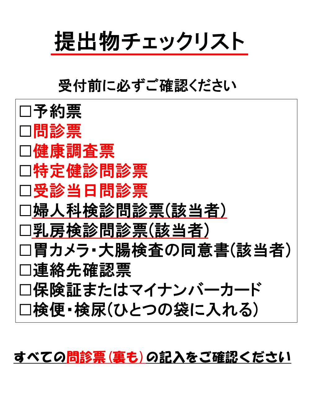 - 当日の体調を送付された「受診当日問診票」に記載し、提出してください。院内には多くの患者さんがいらっしゃいます。新型コロナ、インフルエンザ、感染症腸炎などの感染症予防にご協力ください。発熱・下痢・嘔吐の症状がある方は、受診日の変更をご検討ください。体調に不安のある方や同居の方がこのような症状の場合などにも受付にご相談ください。体調や症状によっては健診日の変更をお願いする場合があります。(無料)